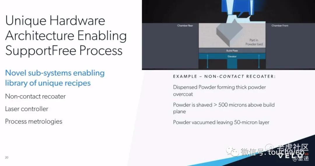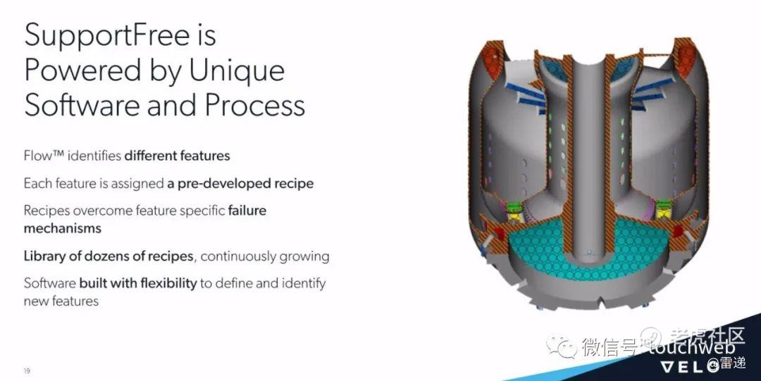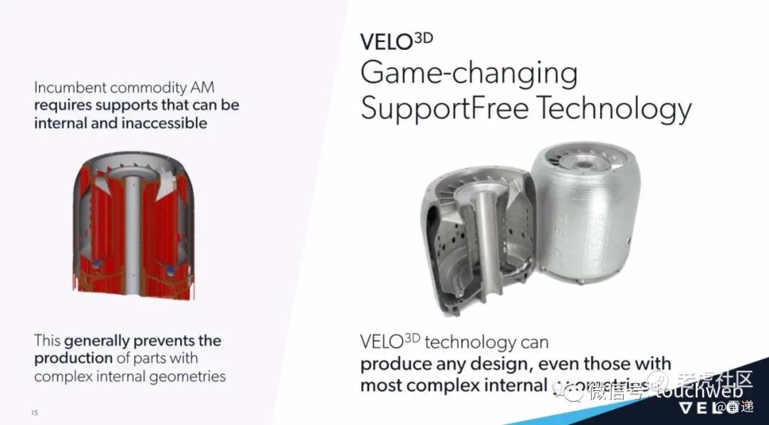 与传统的SLM技术不同,Velo3D能接近实现无支撑制造,实现在现有的金属3D打印机上无法制造的几何形状。其通过软硬件组合方案解决粉末床激光熔融技术所固有的许多挑战,包括设计限制、过程控制和一致性。