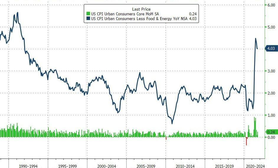 核心CPI(去除食品和能源)同比上升4%,与预期持平,前值3.7%;环比上涨0.2%,符合预期,前值为0.1%。