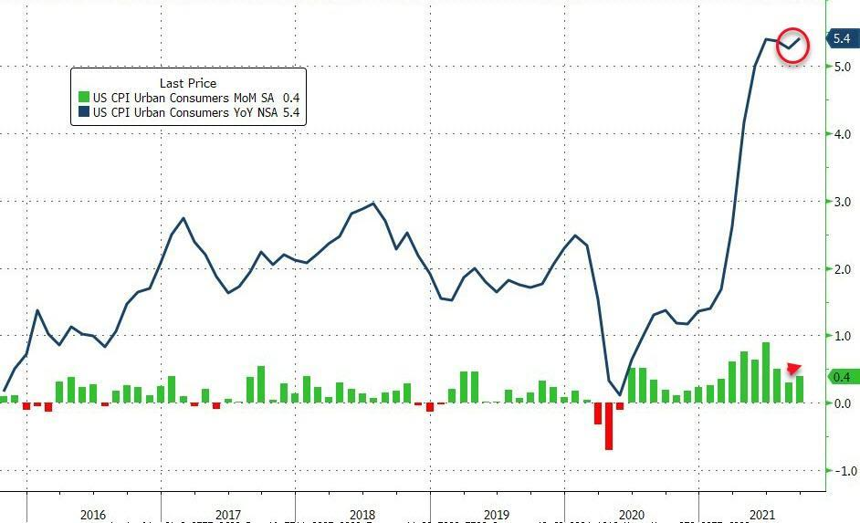 9月CPI同比上涨5.4%,市场预期为5.3%,连续第5个月同比增长超过5%,也是连续16个月上涨,并且是2008年7月以来最高水平;同时环比上涨0.4%,市场预期的0.3%,前值为0.3%。