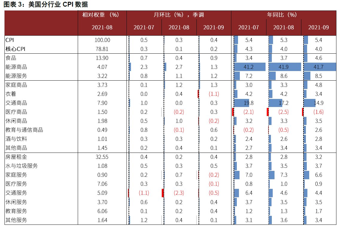 我们从分项来看CPI的变化,环比增幅较大的(核心)项目主要集中在家庭装修(1.3%)、园艺服务(1.9%)、房租(0.4%)。美国夏季疫情的反复使部分消费者重新开始居家办公,因此增加了对家用商品和服务的需求。而另一方面,在供给侧也出现了瓶颈,新车价格在上涨,但与外出相关在回落。
