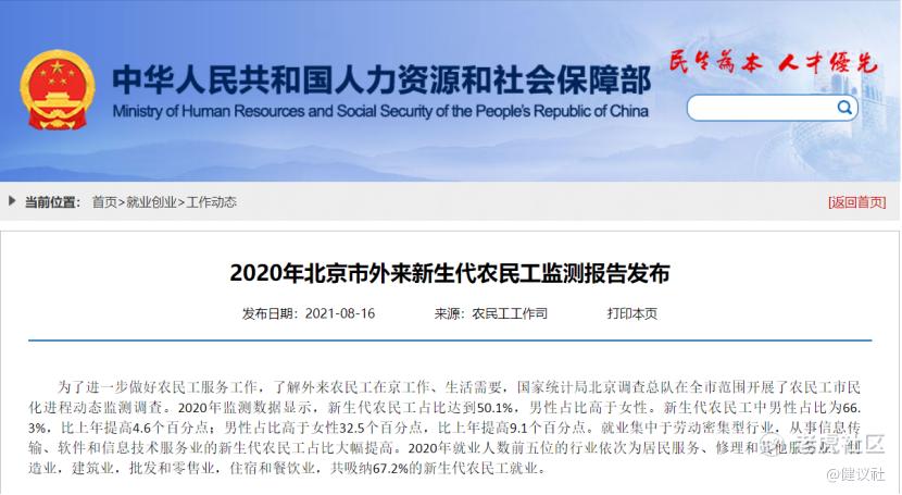 8月16日,人社部网站消息,“2020年北京市外来新生代农民工监测报告”(下称监测报告)近日发布。