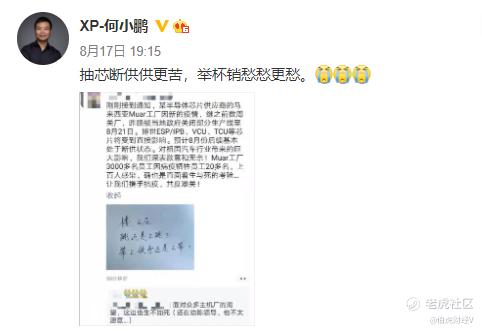 当晚,何小鹏在微博上写上了一首“诗”:抽芯断供供更苦,举杯消愁愁更愁。后面还附上了三个大哭的emoji表情。