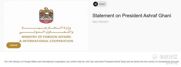 阿联酋:出于人道主义考虑,已接纳阿富汗总统加尼及其家人
