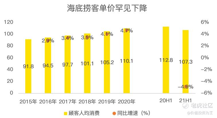 除了翻台率下滑,人均消费额也罕见出现下降,今年上半年,海底捞人均消费金额107.3元,同比去年同期的112.8下降4.9%!