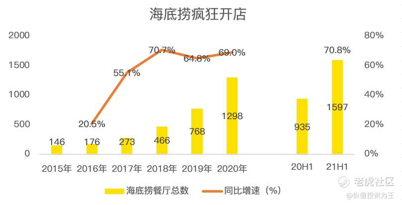 这样的增速初看亮眼,但实际上,去年同期疫情肆虐,餐厅闭门,营收十分惨淡,奠定了低营收基数。而最近1年,海底捞疯狂开店,截止6月底的餐厅数量达到1597家,较去年同期增长71%。