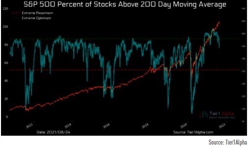 标普指数创新高,但是在200日线以上的股票却开始下降…嘴里有血的味道