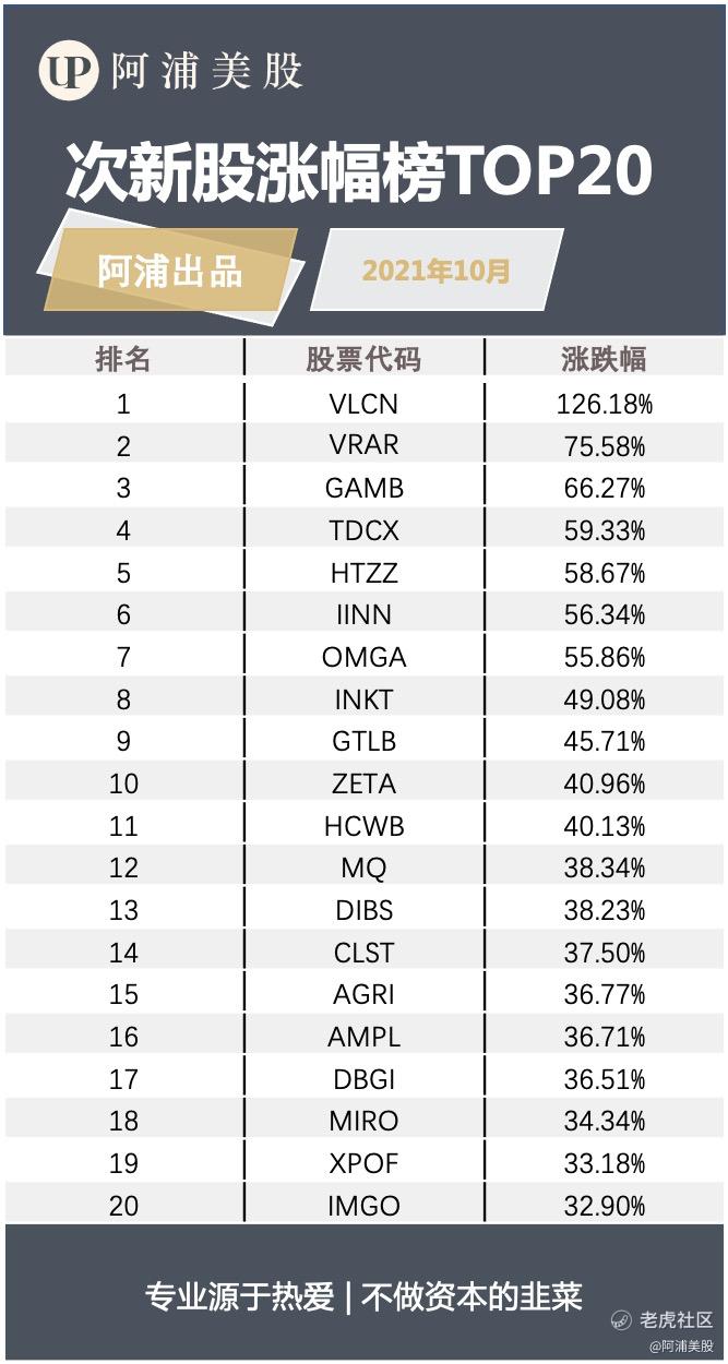 2021年10月1日至10月31日截止,所有在美国证券市场上市的次新股十月股价涨幅评选。*次新股指自IPO发行日算起到首次解禁期时间内刚上市企业。