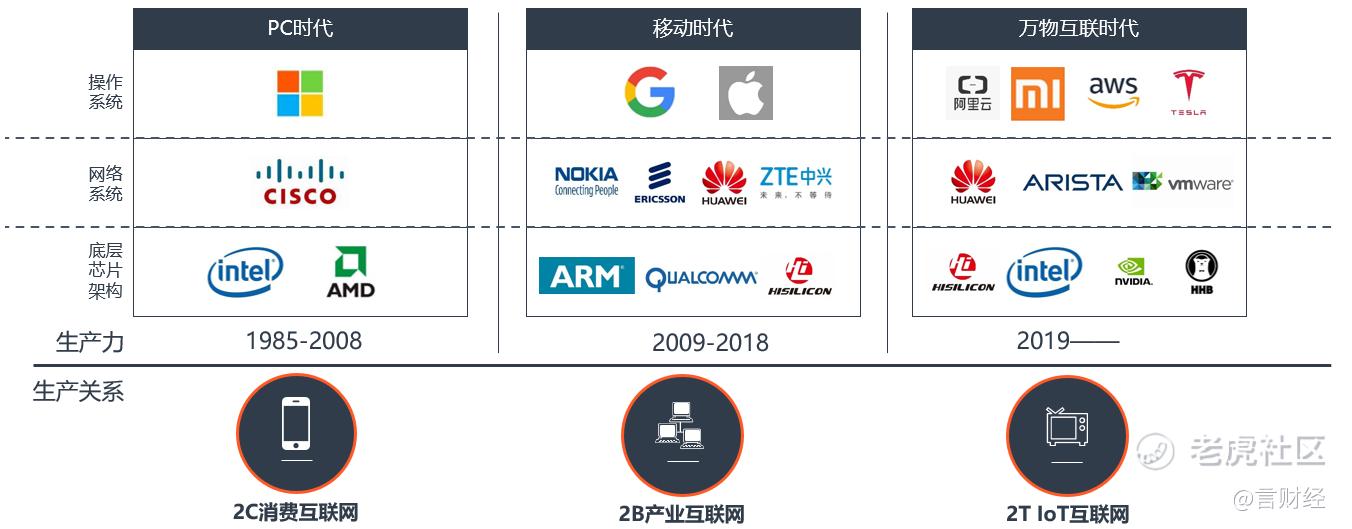 2009-2018年,这个阶段的标志是智能手机的加速普及,伴随2G-3G-4G网络的加速迭代,智能手机行业迎来爆发式增长,释放了巨大的生产力,在这个阶段,移动芯片取代PC时代的CPU成为增长最快的阶段,而PC时代的芯片霸主英特尔与AMD在这个阶段都没有踩准行业发展的步点,高通、海思、苹果等崛起,而国内的网络厂商也逐步崛起,华为、中兴成为全球排名居前的网络厂商,而移动操作系统则仍然被美国公司垄断,苹果IOS与谷歌安卓系统瓜分移动操作系统市场,形成双寡头局面。