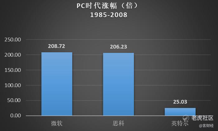 PC时代,PC普及与网络连接,成就生产力核心企业,微软、思科200倍以上的涨幅,CPU核心公司英特尔涨幅也超过25倍,微软在1999年成长为全球市值最大的公司超过通用电气GE,市值高达5830亿美金。