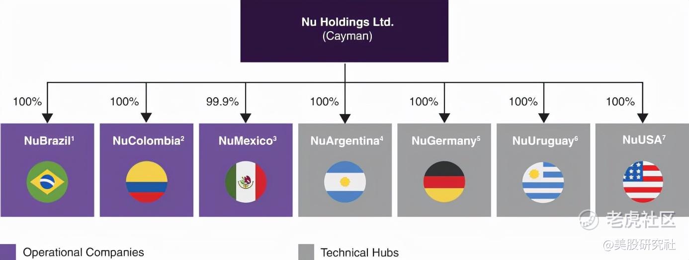 目前,该公司集团由 38 家实体组成,包括 Nu Holdings Ltd. 和旗下 37 家子公司,其中 17 家在巴西注册成立,其余在其他国家注册成立。值得注意的是,Nubank的子公司均未获得银行经营许可。