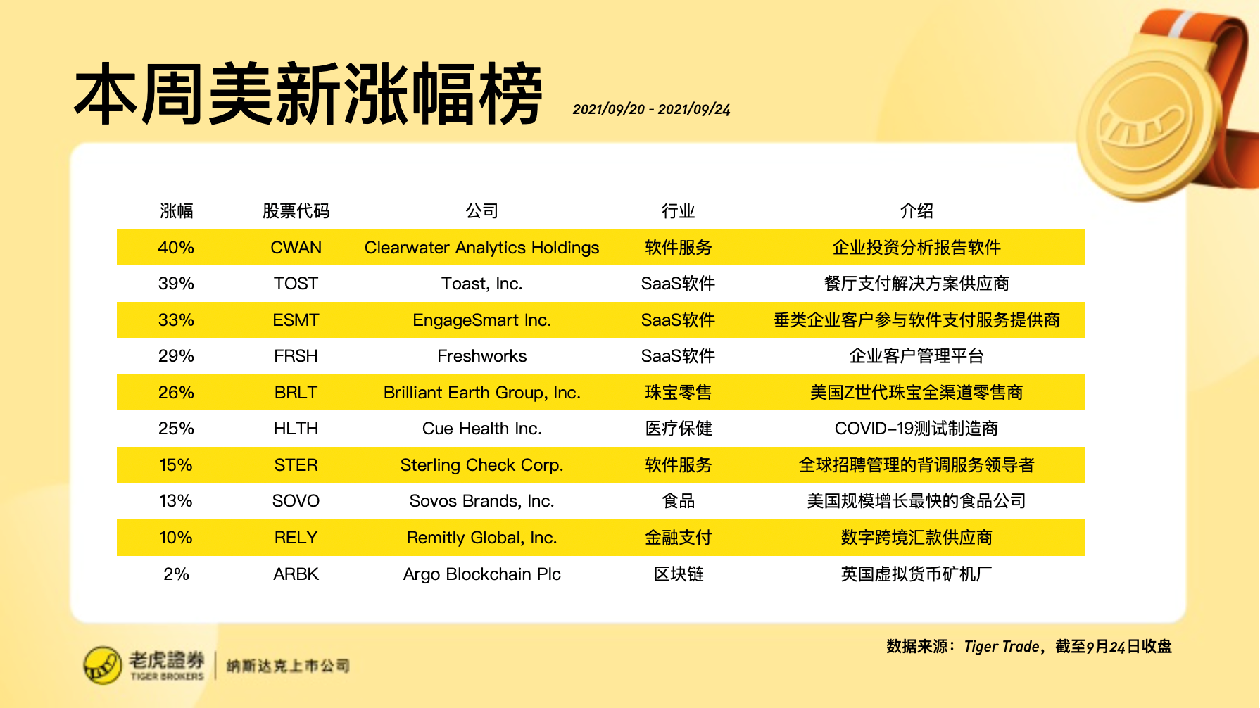 本周有12家新股上市,原本以为本周肯定是哪只SaaS公司夺冠,没成想周五竟然杀出一匹黑马,本周新股冠军竟然是投资分析公司CWAN,累计涨幅40 %,而大家一致看好的Toast屈居第二,累计涨幅39%,EngageSmart稳稳当当,涨幅33%,拿了第三。下面我简单给大家复盘一下本周新股表现!