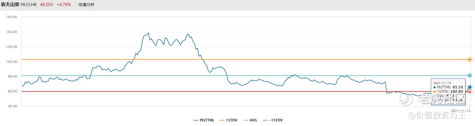 从估值上看,农夫山泉在经历股价大涨之后,PE估值大幅回落,目前估值为66PE。