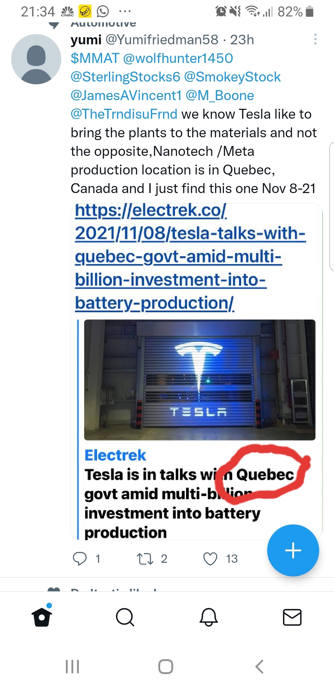 $Meta Materials Inc.(MMAT)$Read and understand. Meta is planning and expending to meet the coming demand and potential partnership or already in talk and agree. Check on it says material for battery and the same location where Elon is trying to be there too. ""Quebec""