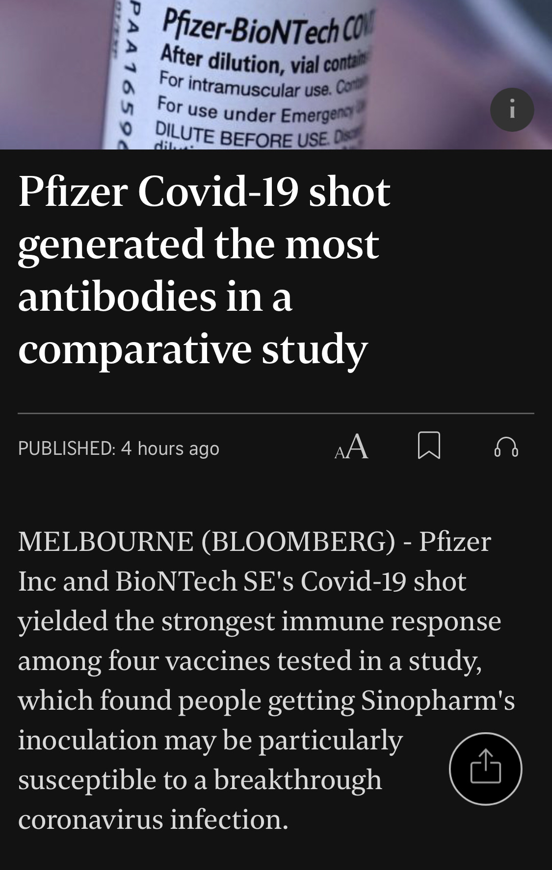 Pfizer Covid-19 shot generated the most antibodies in a comparative study - reported on Straits Times!