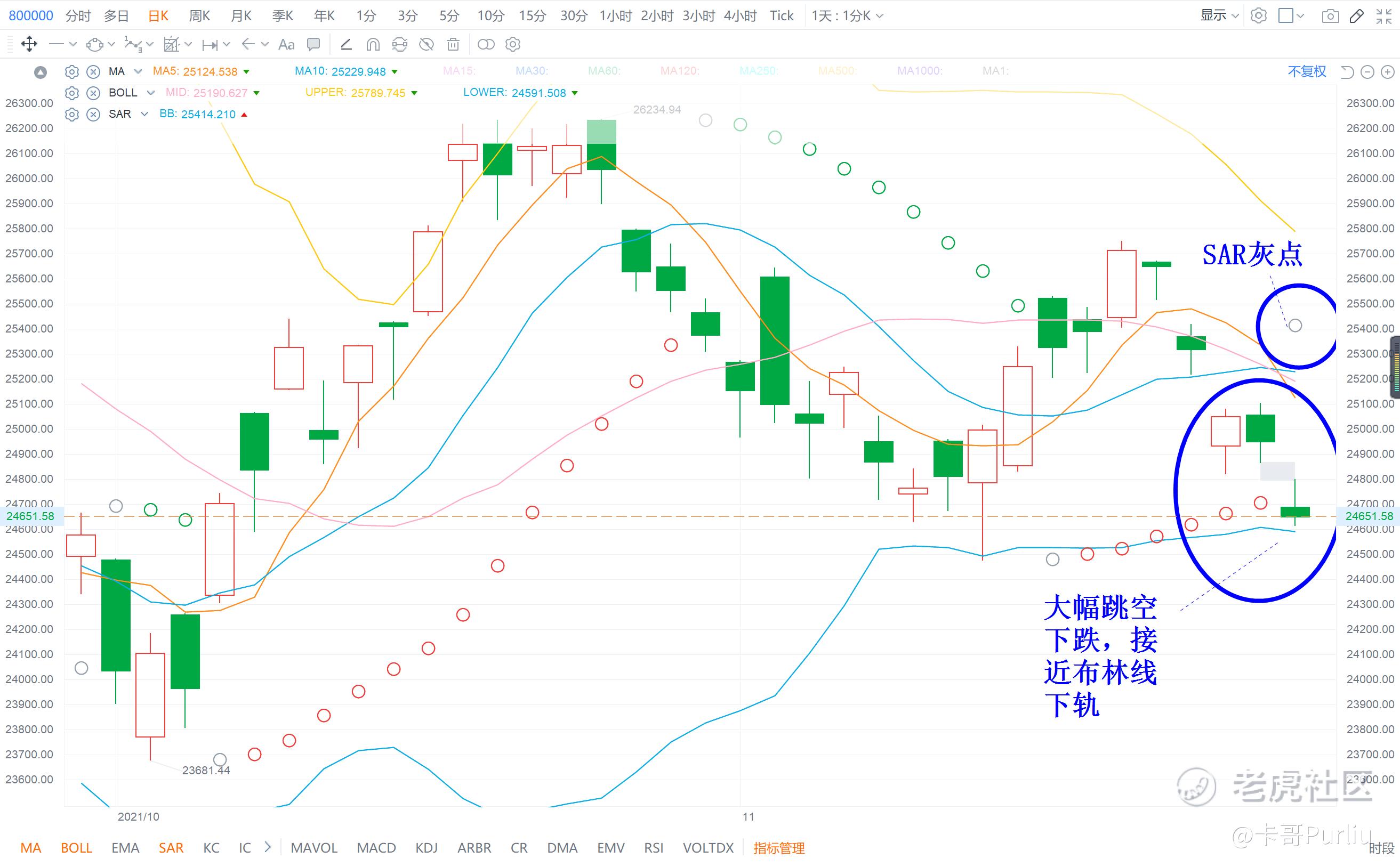 按照日K线看,出现SAR灰点,并且向下跳空后,差点触及布林线下轨;这是否意味着可能会止跌,触底?
