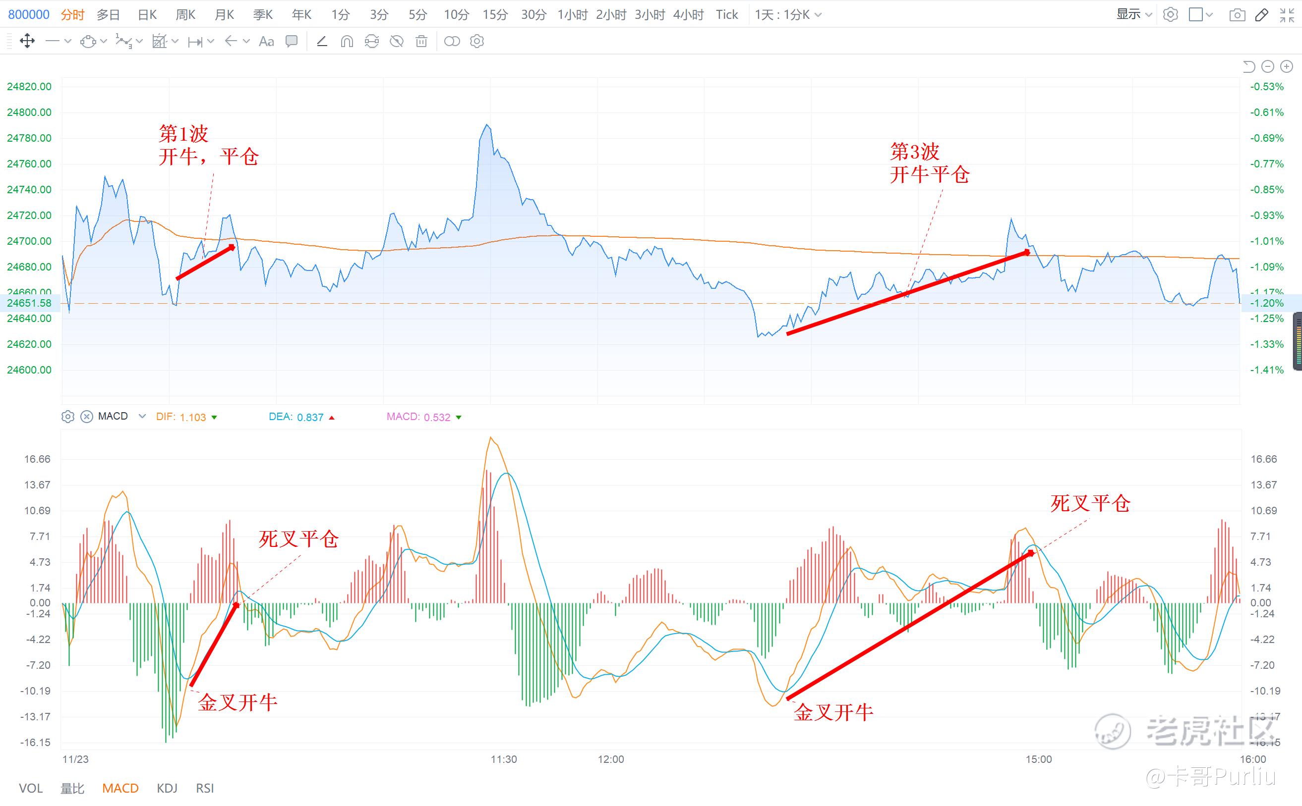 ——按照MACD规则,在10点03左右,此刻,金叉买入牛证,10点20左右,此刻,死叉卖出牛证。