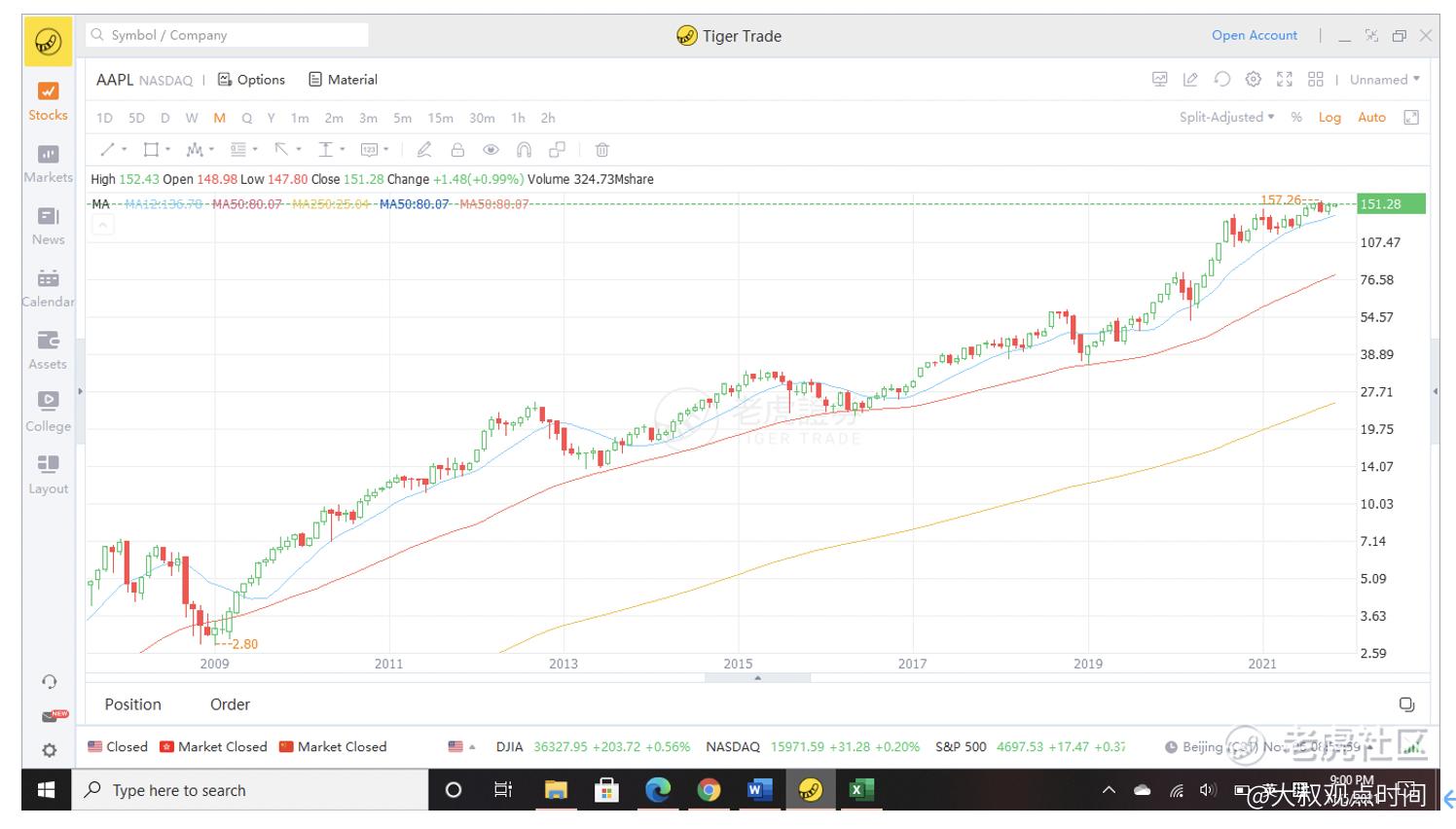 苹果的月线图(自2009年1月截止2021年11月5日)