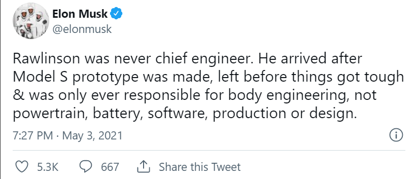 "Elon reached out to me and said, look, I've got a bloody disaster on my hands, will you come and join us? I joined the company and I checked out where they were at. I remember it vividly. After the first few days at Tesla, I went to see Elon at Space-X on a Friday and he asked me: What do you think? I said Elon, it's a disaster. You're going to have to start again. He asked everything? I said yes, look, I know how to do this, let me design Model S from scratch. Elon asked: What, you mean nothing (can be saved)? I said if you want the best car, then trust me, it's from scratch. I thought well, he can only fire me, but he didn't, he said do it - and he meant it. He actually trusted me and empowered me to do it and we did do it." - Lucid Motors CEO Peter Rawlinson on how he was tasked by Elon Musk to engineer the Tesla Model S.