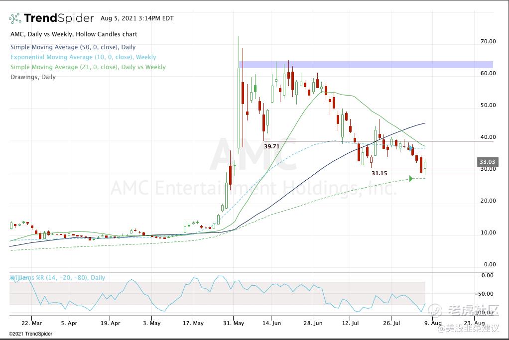 AMC股票仍然被困在30美元和40美元之间,同时也处于21周移动平均线和10周移动平均线之间。21周是目前的支撑位,10周是阻力位。