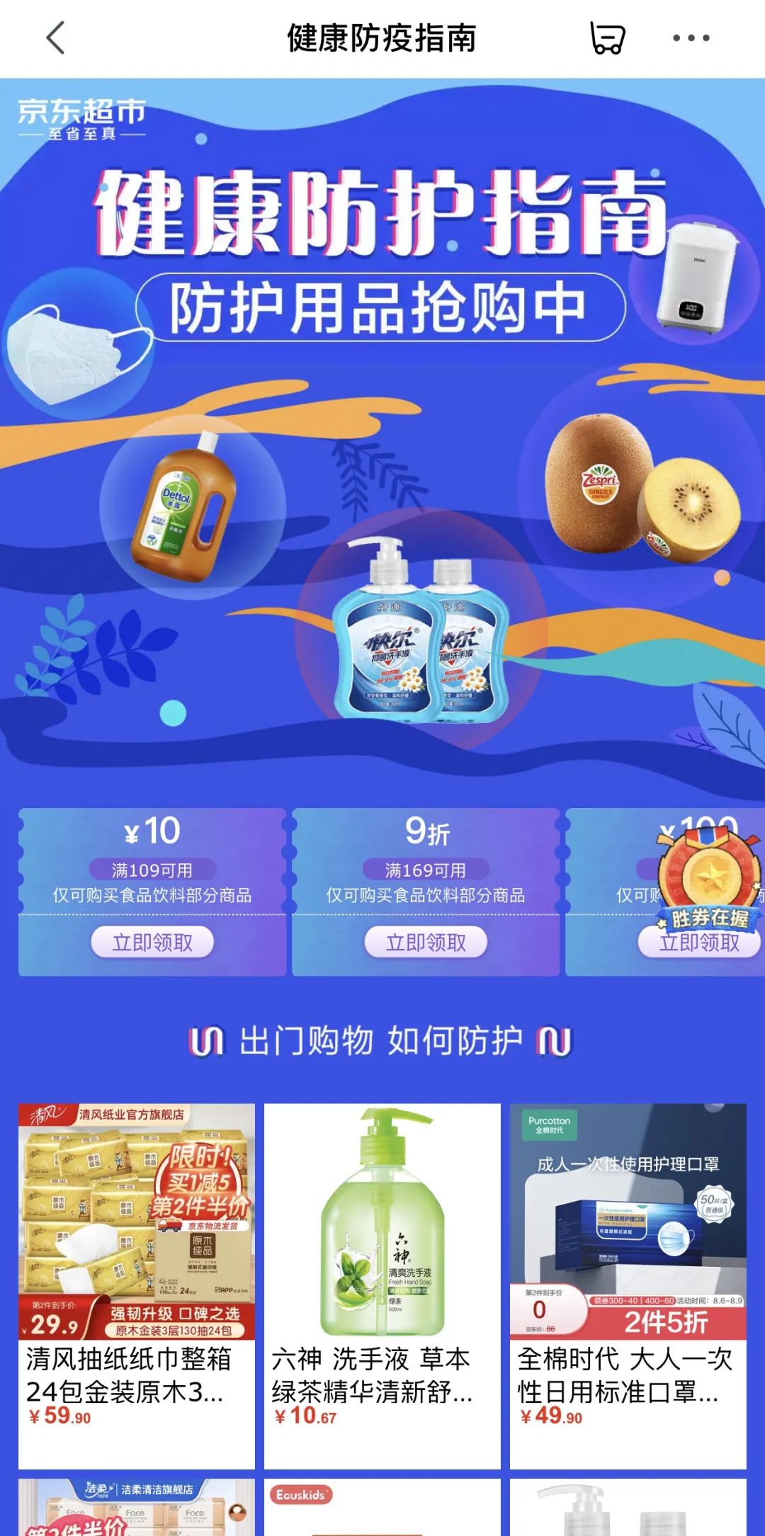面对疫情防控最新变化,为保障消费者能够购买到相关防疫消杀用品,京东超市紧急上线居家防疫专区,并精选15个核心单品包括苯酚消毒液、84消毒液、免洗洗手液、泡沫洗手液、常规洗手液、除菌剂等商品,超日常3倍备货,并时刻监控线上库存状态,确保用户能随时找到、买到。