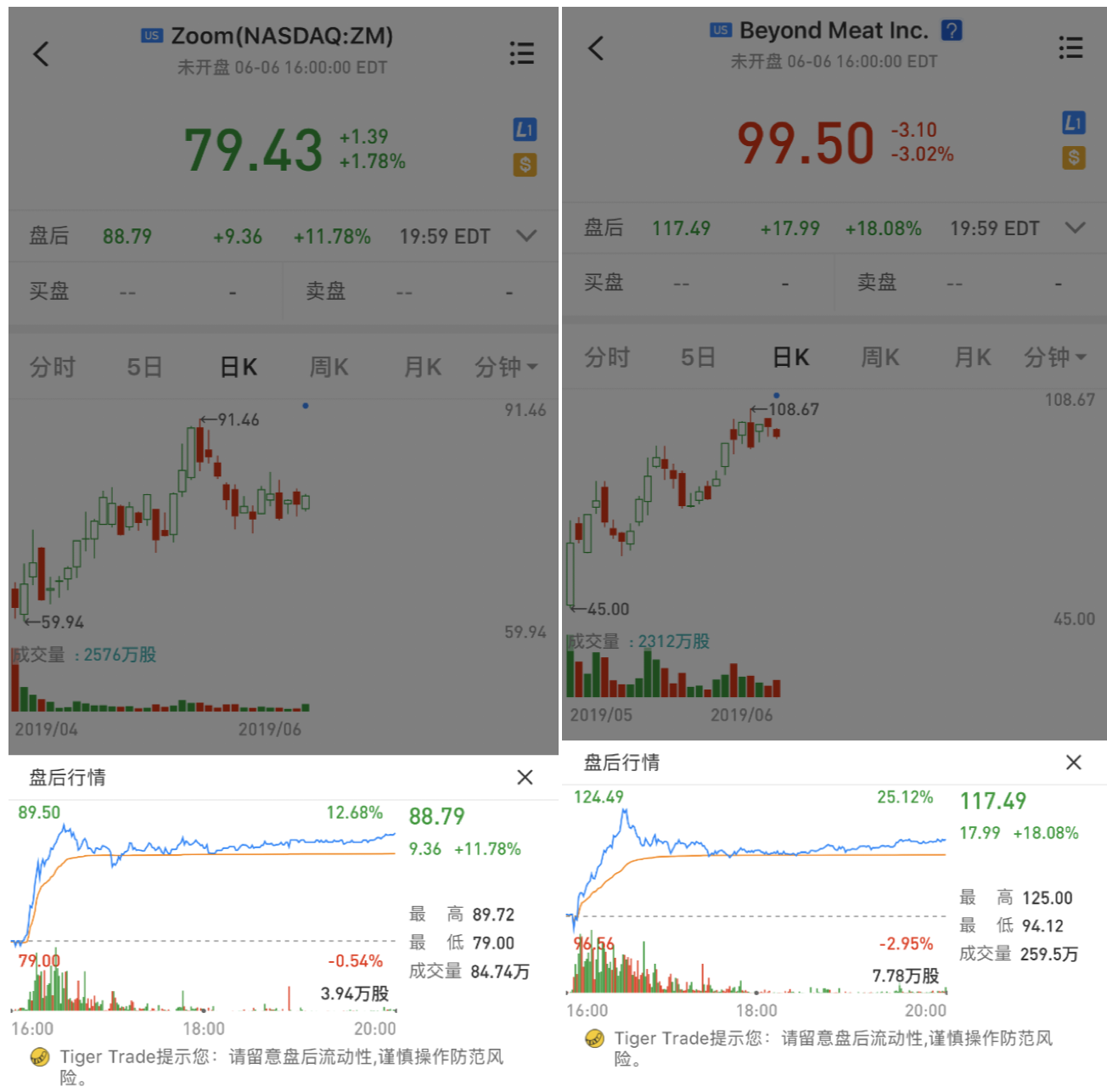 今天凌晨,最强新股$Zoom(ZM)$ 和$Beyond Meat Inc.(BYND)$ 一起发布上市后首份财报,双双超预期,盘后Zoom 大涨12%,BYND大涨18%,BYND盘后最高一度涨至25%。盘后涨跌不代表绝对,还得看今晚谁的后劲儿更足,大家来猜猜看今晚最更强?