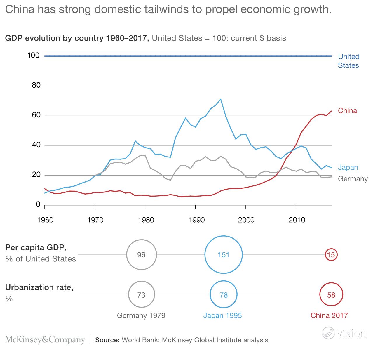 让我们好回顾一些历史,在购买力平价的基础上,中国在GDP方面已超过美国,2017年占世界GDP的18.3%。然而,中国距离恢复历史上的辉煌还有一段距离。两千年前,中国曾占世界GDP的近三分之一(见下图)。全球咨询公司麦肯锡(McKinsey)因其对趋势的分析而声名鹊起,在最近的一份报告中强调,它坚信中国将继续崛起。一个很好的例子:截至2017年,中国城市化率为58%,距离德国和日本达到几十年前的水平还有一段距离(见下图)。因此,通过不断增长的城市化和各种提高人均GDP和生产率的途径,中国仍有很宽广的发展空间。