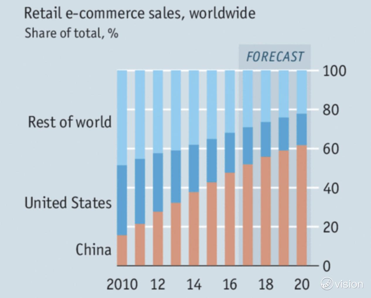 以电商为例,中国市场的电商份额占据全球一半以上,拥有诸如亚马逊沃尔玛等巨头的美国电商市场仅占据全球的20%。