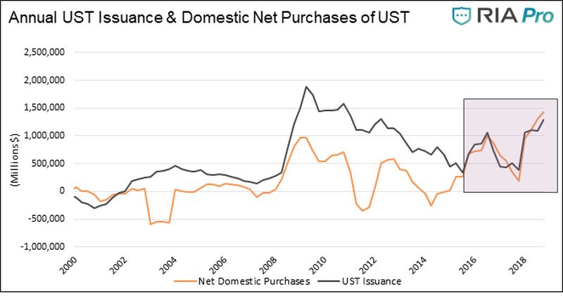 由于外国实体和美联储不购买美债,只能由美国国内投资者填补这一缺口。