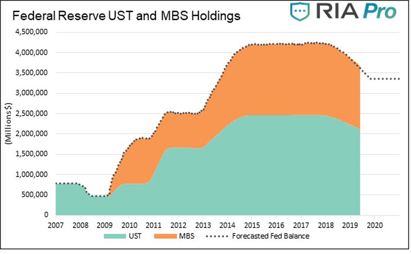 2017年10月,美联储启动资产负债表正常化,即通过量化紧缩(QT),减少美国国债和MBS的持有量。从那以来,他们减持了超过2000亿美元的美国国债。尽管美联储此前每月减持500亿美元美国国债和MBS,但减持步伐已经放缓,并且打算到9月底停止缩表。