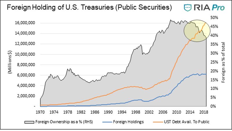 下图显示了外国持有的美国公共债务数量和占比(不包括政府内部持仓,如社会保障行政投资),以及未偿还公共债务总额。可以看到,过去几年出现的分歧是最近40年来无可比拟的。
