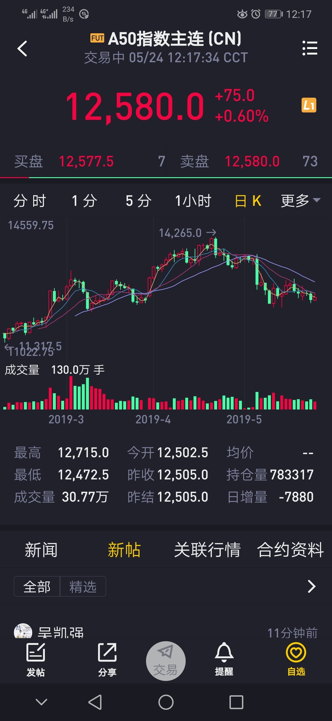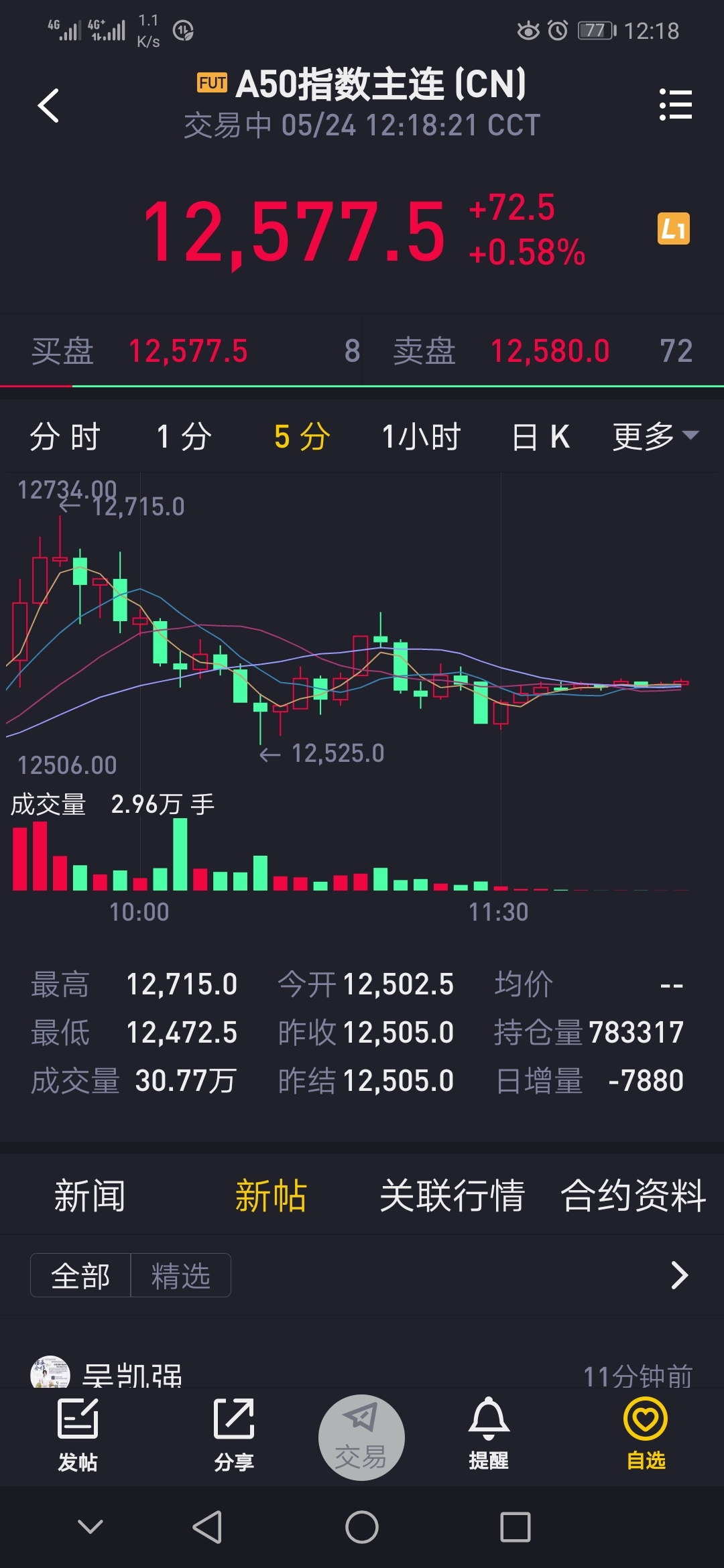 $FUT:A50指数主连(CNmain)$ 不好玩,快速拉高后回落,很难把握住,目前阶段还是不好操作,只有确认突破趋势,不管向上或者向下,才好把握机会,建议观望休息,看5分钟k线图,成交量很小了,说明大家都很谨慎在观望等待方向,小时线里趋势还是往下的,没量上不去,只要放量就往下走,多和空现在维持在一个平衡点,一旦放量下跌必然加速往下走,把握不住就不如休息观望,等待确定机会在玩儿!