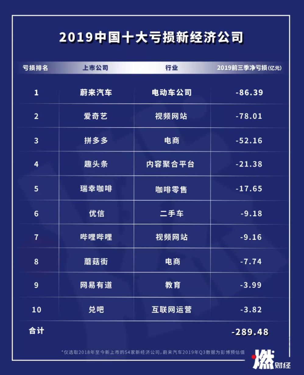 根据燃财经统计,2019年上半年,亏损最多的25家公司合计亏掉近200亿元;算上今年第三季度,排名前10的亏损大户总计亏了289亿元。
