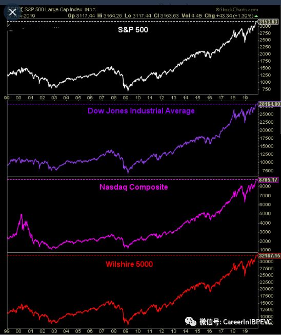根据高盛统计数据,从2009年6月美股见底到2019年11月底,美股经历了史上最长牛市(最大回撤不超过20%),在这轮牛市里,标普500指数、道琼斯、纳斯达克以及威尔逊5000指数全部创下历史新高。