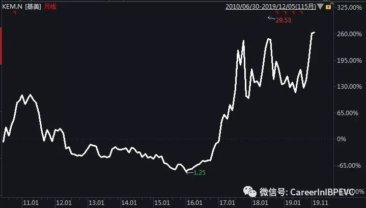 排名第四的KEMET(NYSE:KEM)涨幅也高达110倍,是一家美国电容器制造商,例如钽、铝、多层陶瓷、薄膜、纸张、聚合物电解和超级电容器。Kemet还生产其他各种无源电子元件,如交流线路滤波器、EMI磁芯和滤波器、挠性抑制器、机电设备(继电器)、金属复合电感器、铁氧体产品以及变压器/磁性器件。
