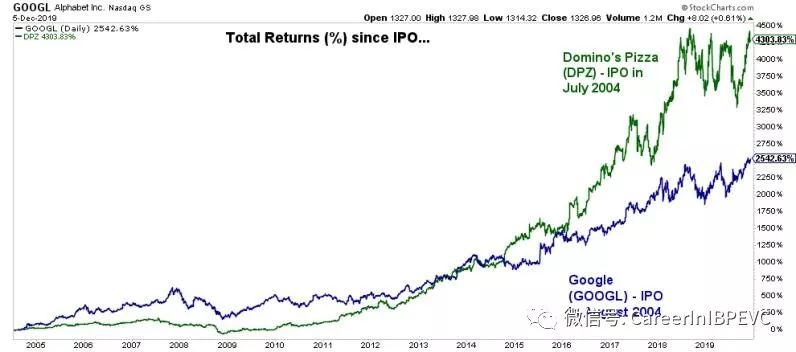 细看这轮长牛中,走势最牛的10家公司,涨幅至少都在60倍以上,但是出人意料的是没有一家科技公司,虽然他们日常霸占了媒体头条。热闹的不一定是涨的最好,同样在2004年IPO的两家公司,谷歌(NASDAQ:GOOGL)是媒体头条常客,达美乐披萨(NYSE:DPZ)相对更低调,但是二者的涨幅整整差了20倍,达美乐上市以来翻了43倍,谷歌涨幅只有25倍。