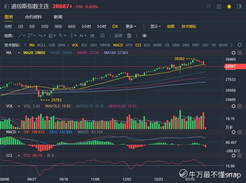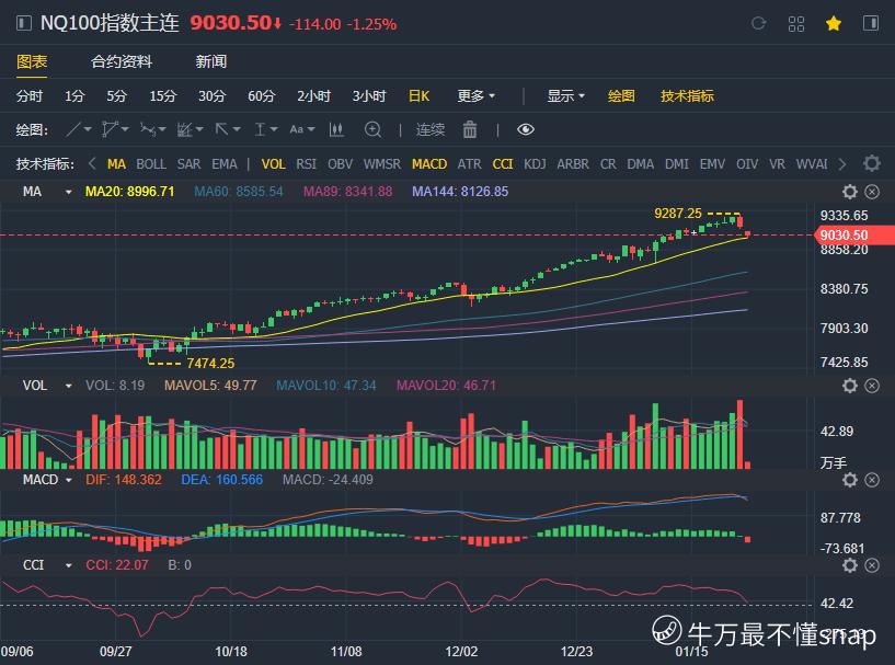 大家好我是牛万,先给大家拜个晚年,鼠年春节大家开始数钱了吗?市场这几天可走的很难看,上周一$道琼斯指数主连(YMmain)$ 触顶后已经开始了调整,截止上周五,道琼斯指数收跌28906(20日线支撑位)略有回弹,今天早盘看,期货指数已经低开跌破,而强势的$NQ100指数主连(NQmain)$ 指数也由上周五放量下跌,正在考验8996.38(20日支撑位),我判断大概率还会继续下跌。