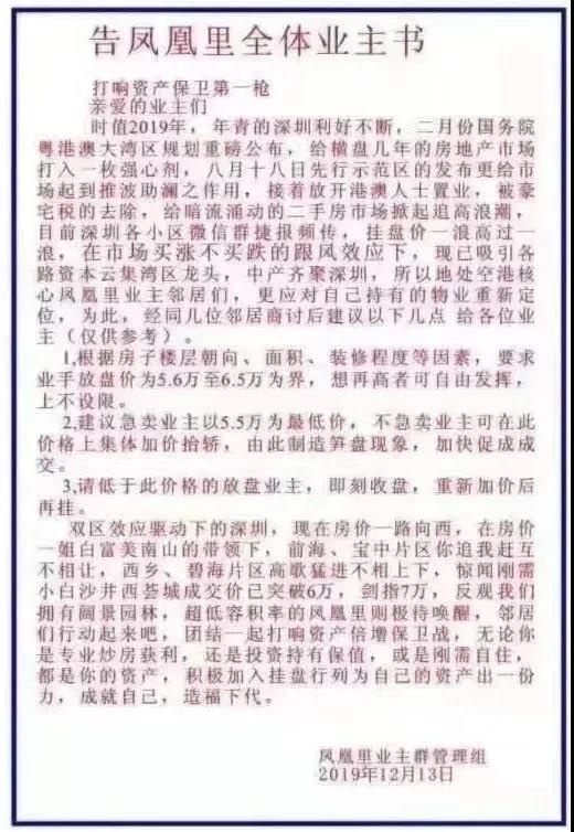 请大家不要为了一己私利低价出售房产,我们应该集体挂高价格,共同获利。