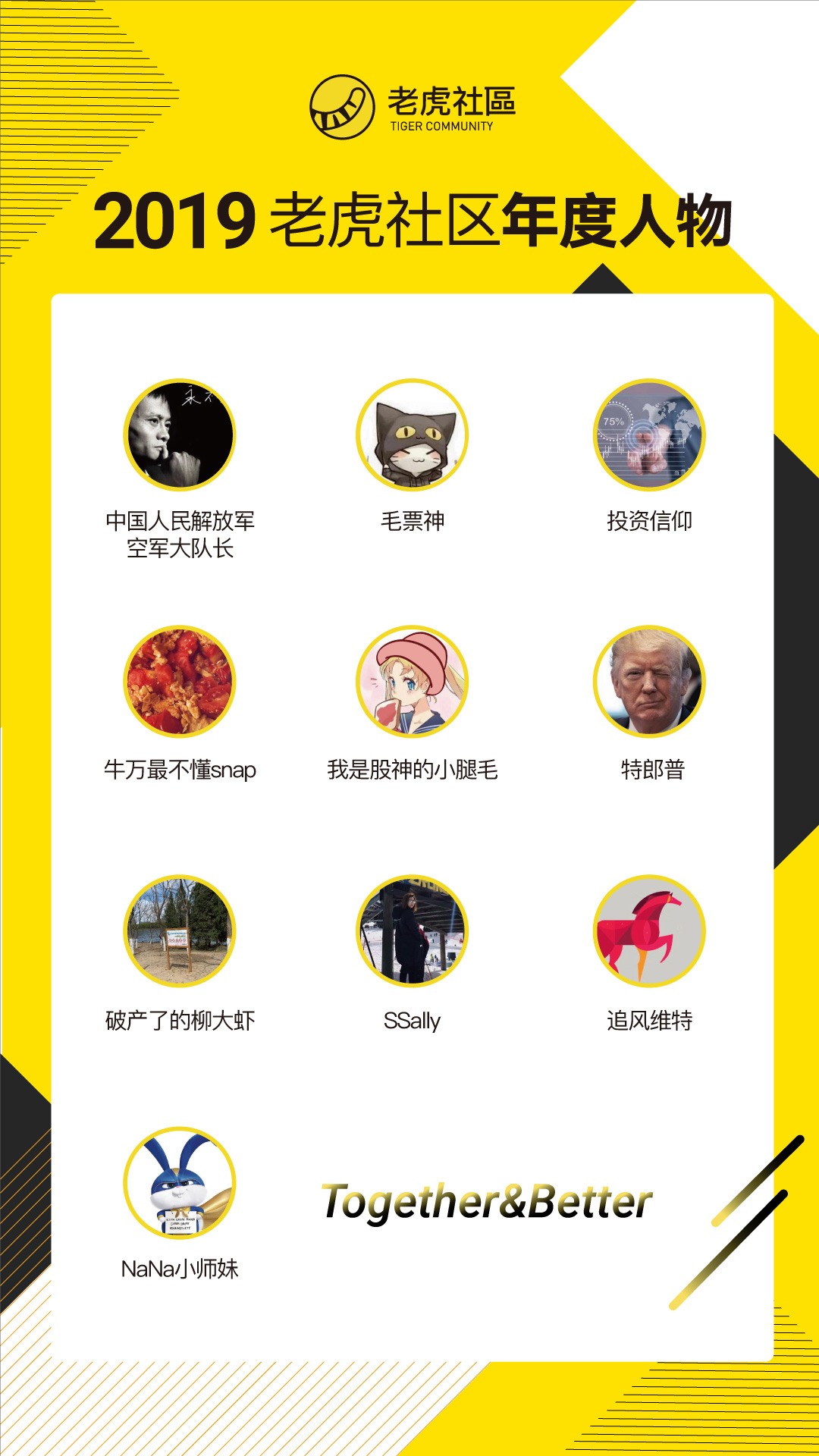 大gia好,万众瞩目的老虎社区年度人物榜单即将揭晓,快来看看你的爱豆有没有获奖?首先小虎要公布2019年度影响力排名前十的虎友(请点击这里查看投票情况)