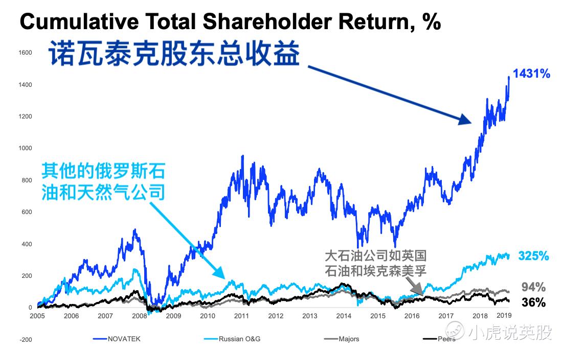 以下图片显示诺瓦泰克股东的总收益从2005年至2019年底[呆住] (含股息)小虎们可以看到公司的总收益超过其他大西方能源公司如埃克森美孚和俄罗斯其他的能源公司。