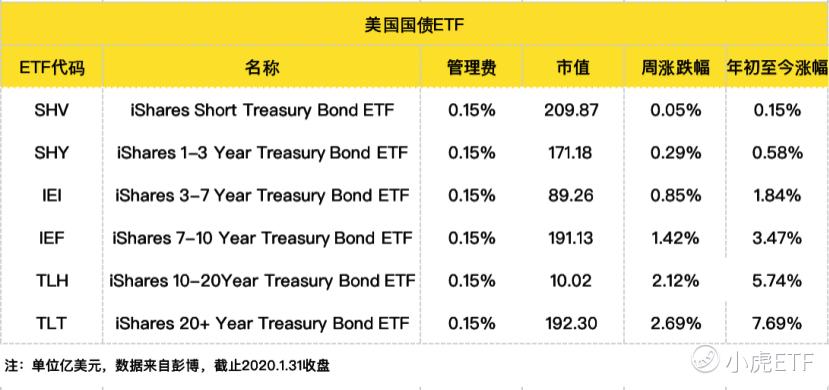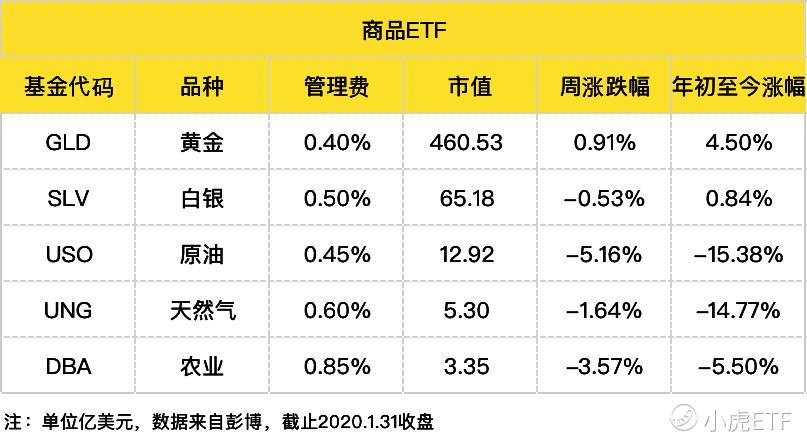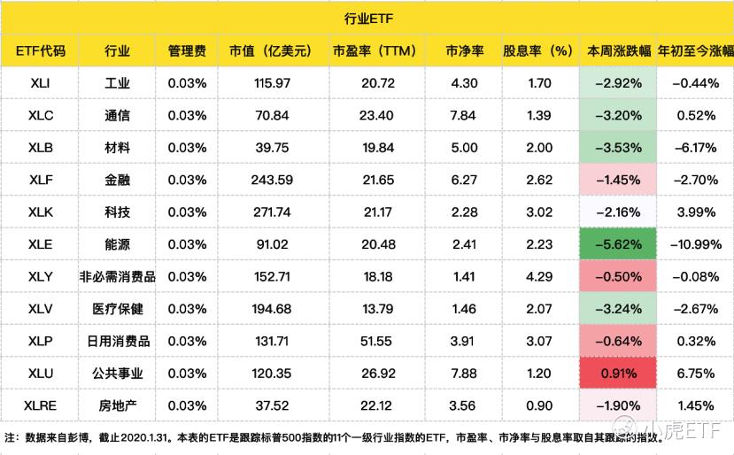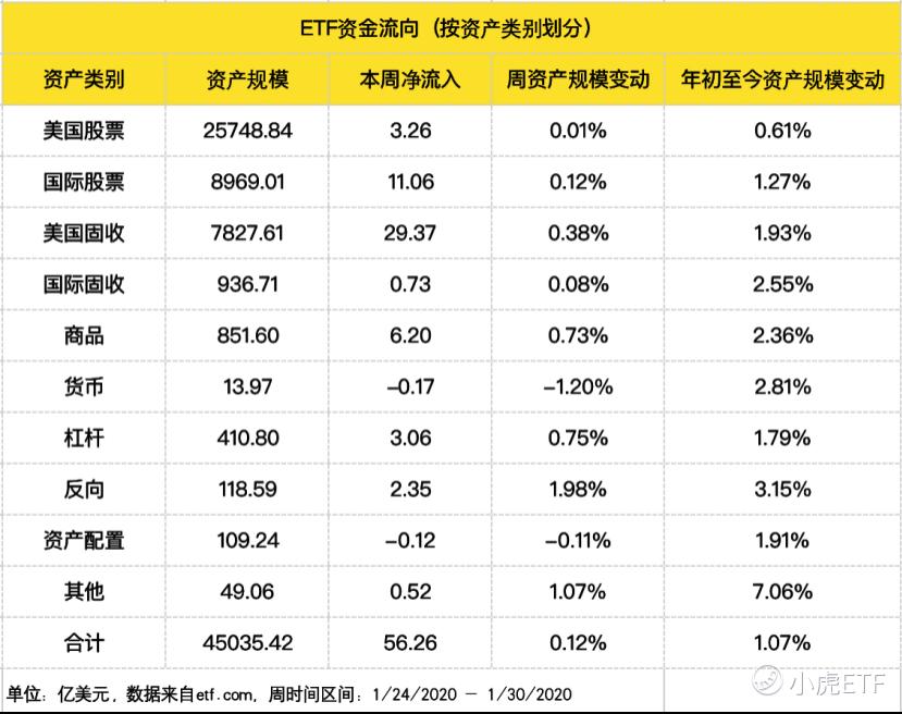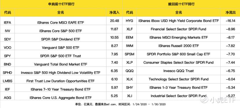 在这一周,全球上下都陷入了对于新型肺炎的恐惧中,在WHO宣布该疫情成为全球卫生紧急事件之后,中国作为世界工厂,受到阻碍的国际物流将对其他国家的零售和制造业等造成巨大影响。因此我们可以看到本周有30亿美元流入了债券ETF,投资者在寻求一些国际投资和投资级债券ETF。因此在净流入中,远东欧澳ETF(EAFE)获得最高净流入20.48亿美元。先锋全债ETF($债券指数ETF-Vanguard美国(BND)$ )和iShares核心美国全债($债券指数ETF-iShares Barclays综合国债(AGG)$ )分别获得了7.95亿和5.25亿美元。$老虎中美互联网巨头ETF(TTTN)$ $标普500ETF(SPY)$