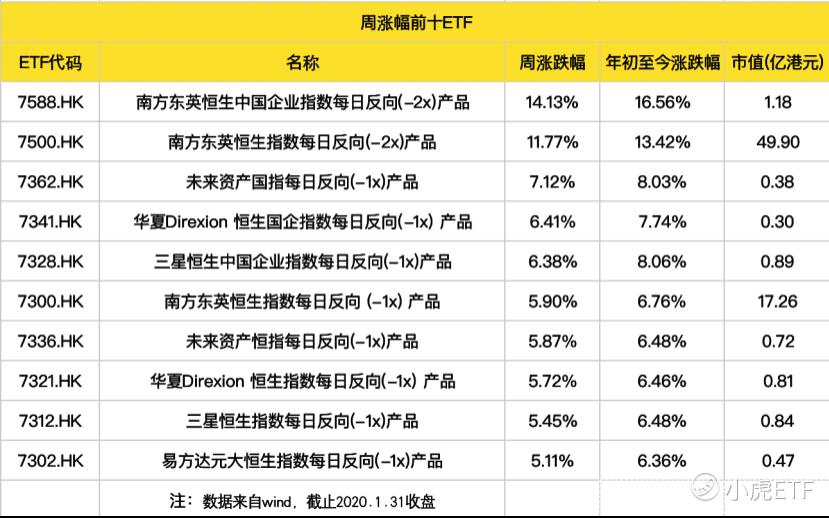 本周全球市场因为疫情动荡,上榜的香港ETF均为反向产品,两倍做空中国企业和恒指$FI二南方国指(07588)$ 和$FI二南方恒指(07500)$ 周涨幅为14.13%和11.77%,尽管A股仍未开盘,但外盘的a50如今跌幅不小。