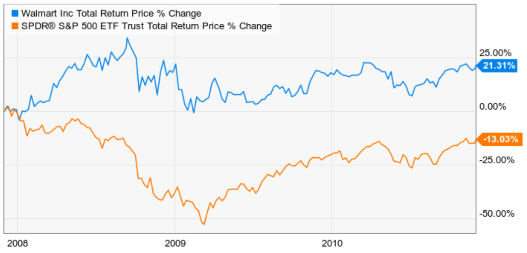 沃尔玛 (纽约证券交易所:WMT)是一家可以发展壮大的企业。为证明这一点,请看金融危机开始的三年中,公司的经股息调整后的总回报率与标普的对比。