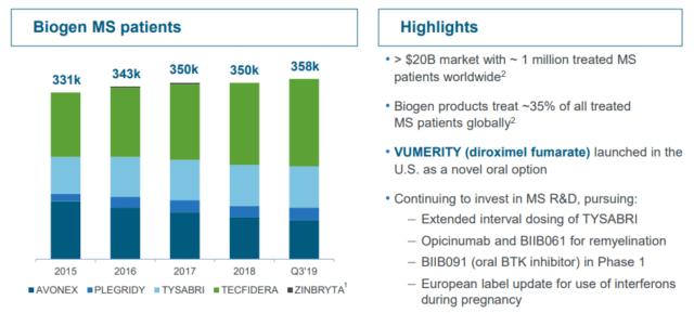 它的核心特许经营权是MS,这一事实从该公司的“产品治疗了所有MS患者的约35%”这一事实就可以明显看出。换句话说,Biogen的质谱业务为公司的每股收益产生约16美元的年度利润(目前交易价为330美元左右)。尽管已经拥有了市场领先的份额,该公司仍继续扩大其产品组合并投资于MS研发。该公司还有许多其他药物可以帮助其扩大市场和收入。