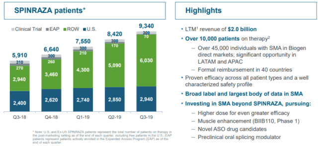 另外,Biogen的Spinraza在新产品上做得非常出色。该药的“ LTM收入为20亿美元,接受治疗的患者超过1万人”(即,每位患者每年20万美元的收入)。该公司已经“在40个国家/地区拥有超过45,000名SMA个人的正式报销”-它具有巨大的扩展潜力。该药的年收入和正式报销额的增长表明其已迅速发展为重磅炸弹。病人终身使用它以及高额的年收入支持持续的财务成功。