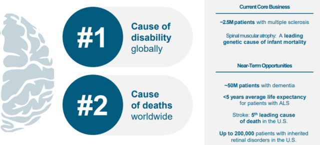 大脑是最不了解的器官之一,对现代医学的影响显而易见,与神经系统有关的健康问题迅速成为主要问题。Biogen处于解决此问题的最前沿。该公司的MS计划有约250万患者(该疾病的发病率约为1/400人)。此外,该公司的SMA计划正在努力解决一个巨大的问题,即“婴儿死亡的主要遗传原因”,而且在这里确实面临竞争,我们将在后面讨论。