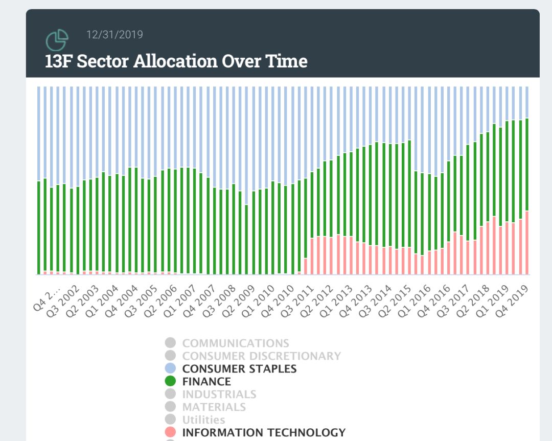 来源:whalewisdom 网站 注:粉色为信息科技在组合中占比,绿色为金融,蓝色为必需消费。