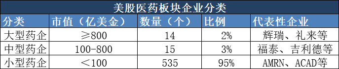 从上图可以看出,美股医药板块按市值构成的情况,有几点需要跟大家说明一下: