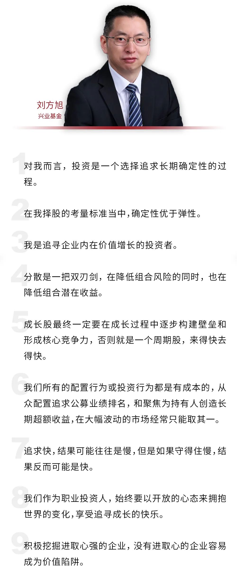 兴业基金的刘方旭是笔者认识超过10年以上的老朋友,在最新的一次访谈中也能深深感受到时间在他投资中的沉淀。刘方旭认为,投资收益来自长期持有优质公司的能力。一个公司只有在竞争力强上有比较高的长期确定性,才值得被长期持有。刘方旭看重投资收益的确定性多过弹性,这让他在选股的时候,将主要精力放在盈利稳定的消费、医药及有壁垒的成长行业。