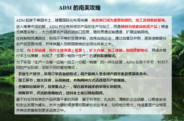 2010年后,国内的顶级智库开始关注、研究 ABCD 等跨国粮商的商业模式,并逐渐在农垦系统及央企、国企系统内进行复制、推广,希望:培育出一批农业龙头企业,带动行业升级,以便更深的参与到全球农业供需及流通市场中,获得更高的话语权和定价权。