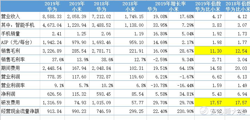 销售毛利华为是小米惊人的11倍,研发费用华为是小米的17倍。
